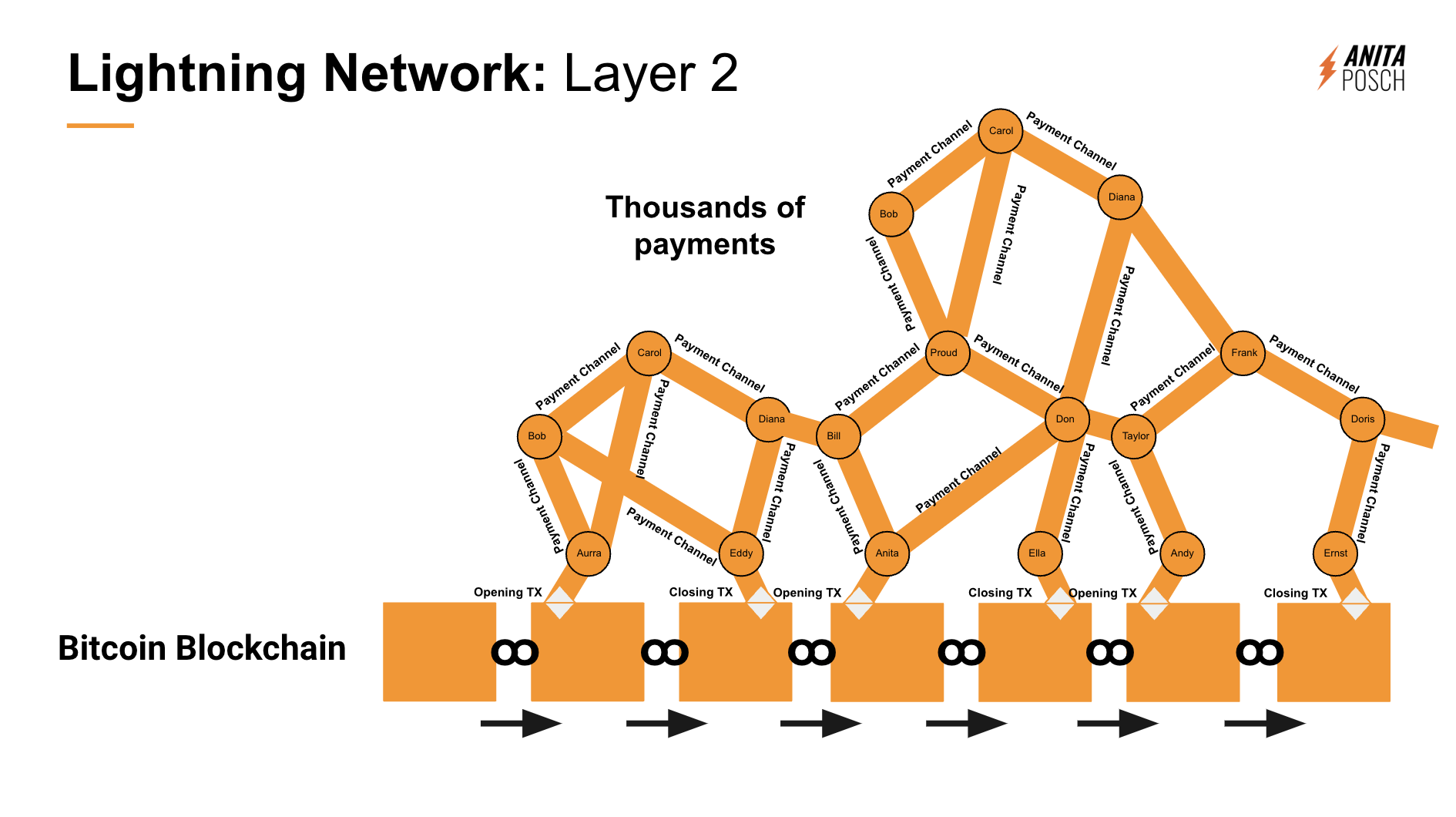 Let’s go on with our example of a house made of bricks with orange sand in them. To move the sand faster, you could drill a hole into a brick and stick a tube into it. Others do the same, connecting these tubes to a network. Now the grains of orange sand can float freely inside the tubes from one person to the other. Each grain is a satoshi and now they can move faster and cheaper without the need for a blockchain. That’s an analogy for the Lightning Network, it is bitcoin, it is the exact same asset - an orange grain of sand that’s fungible. Just like the bitcoin in the brickwall, you can hold, send and receive the satoshis without permission or the need to trust someone.
