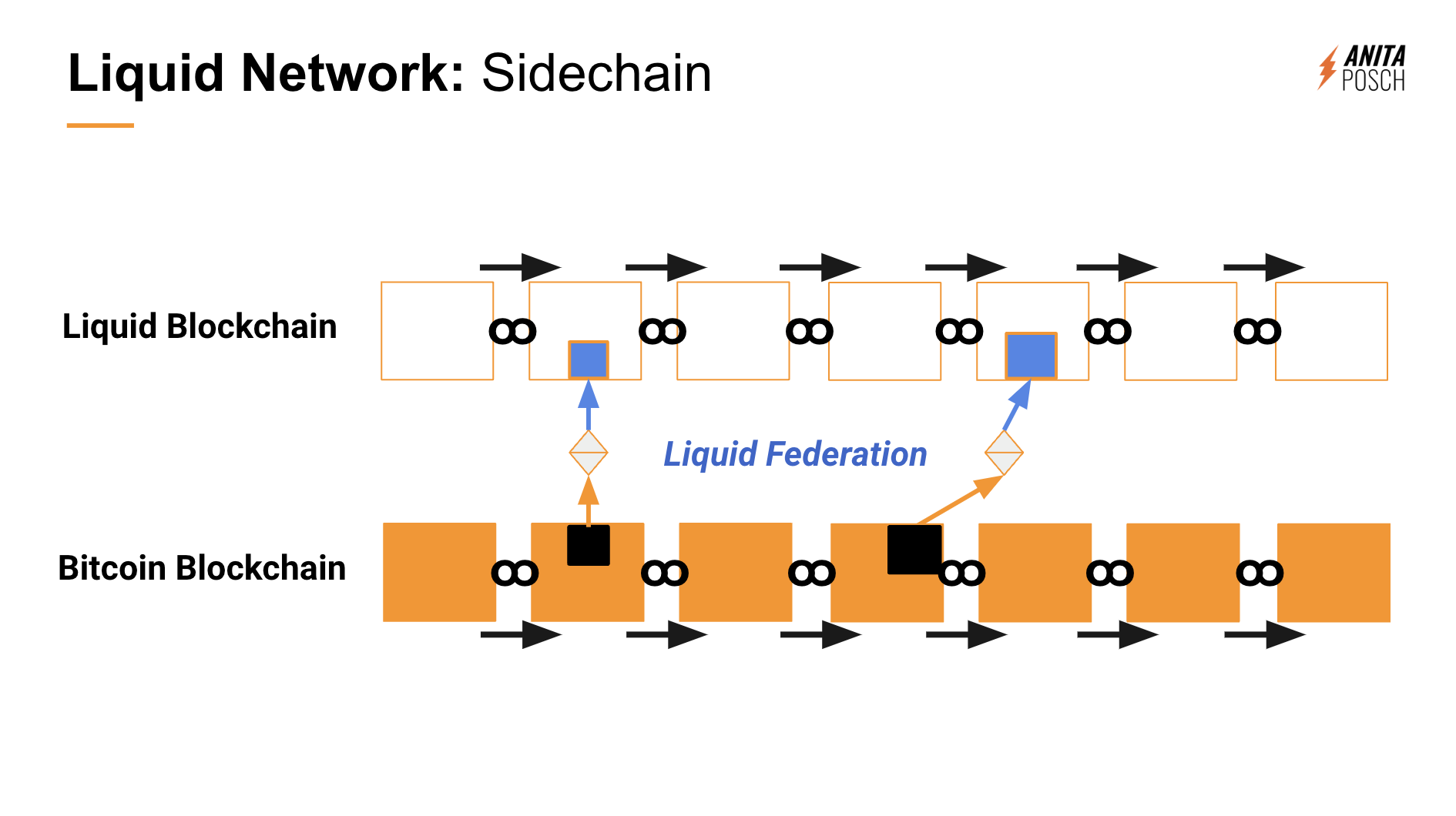 In our picture the Liquid chain of bricks is being filled with blue grains of sand. They are not fungible, they are not the same grains of sand as in Bitcoin, but they are 1:1 backed by orange grains.