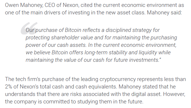 Online game provider Nexon Co. acquired $100 million in Bitcoin. This became the largest-ever purchase of bitcoin made by a listed company in Tokyo. The purchase represents less than 2% of Nexon's total cash and cash equivalents. They are tipping their toes in it, a great strategy to learn for the future. Source