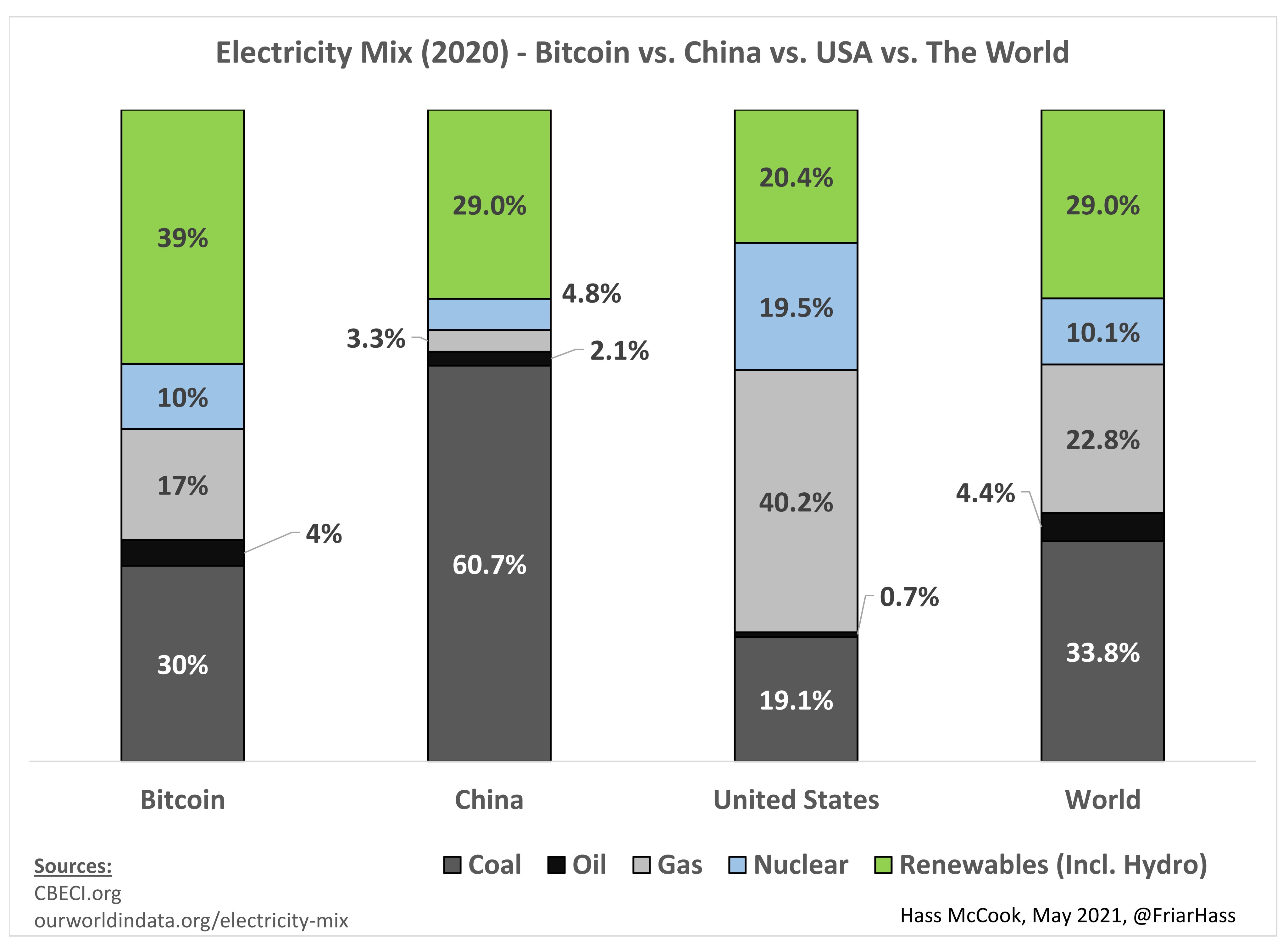 This is good news. Because Bitcoin miners will move their mining rigs from China to other countries, which have a greener mix of electricity sources. While China is producing the same amount of electricity with renewables as the world on average does, their share of coal is higher as we can see from Friar Hass' research.
