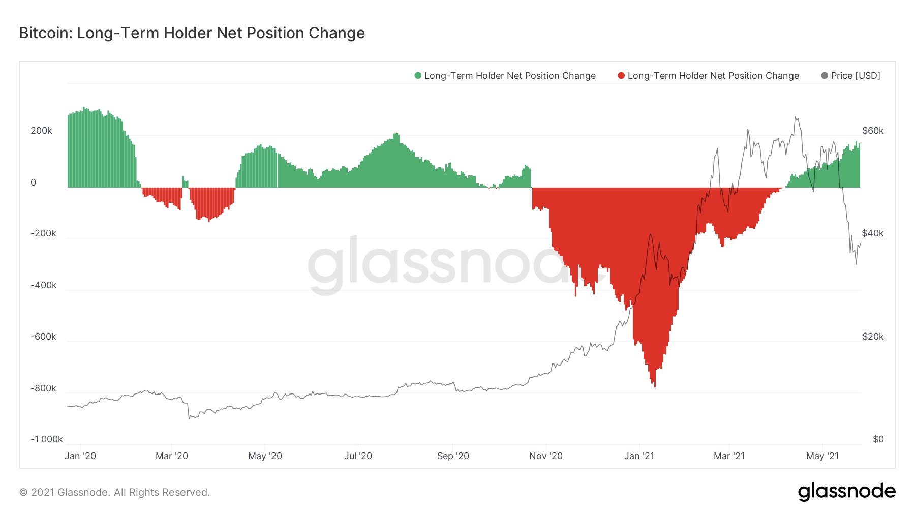 Below chart shows that long-term hodlers have been buying bitcoin since the price plunged in April. The network is healthy, don't let yourself get distracted from media headlines.