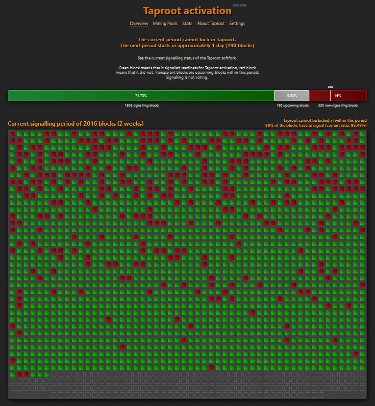 Only a few people really understand what "Taproot" means and how important this update to the Bitcoin Core software is. This soft-fork might be locked-in in a few weeks. The miner signals are looking very promising, still 1815 blocks within a period of 14 days have to signal for Taproot. If they do, Taproot will be automatically activated in November. There is no turning back. The decision can not be changed afterwards. The next signaling period starts tomorrow.