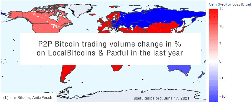 I've built an animation showing the increase and decrease in trading volume on Bitcoin peer-to-peer platforms LocalBitcoins and Paxful within the last year. (Data: usefultulips.org). A lot of trading on other platforms and directly between individuals goes unaccounted for in this illustration, but it shows the overall development in different regions around the world.