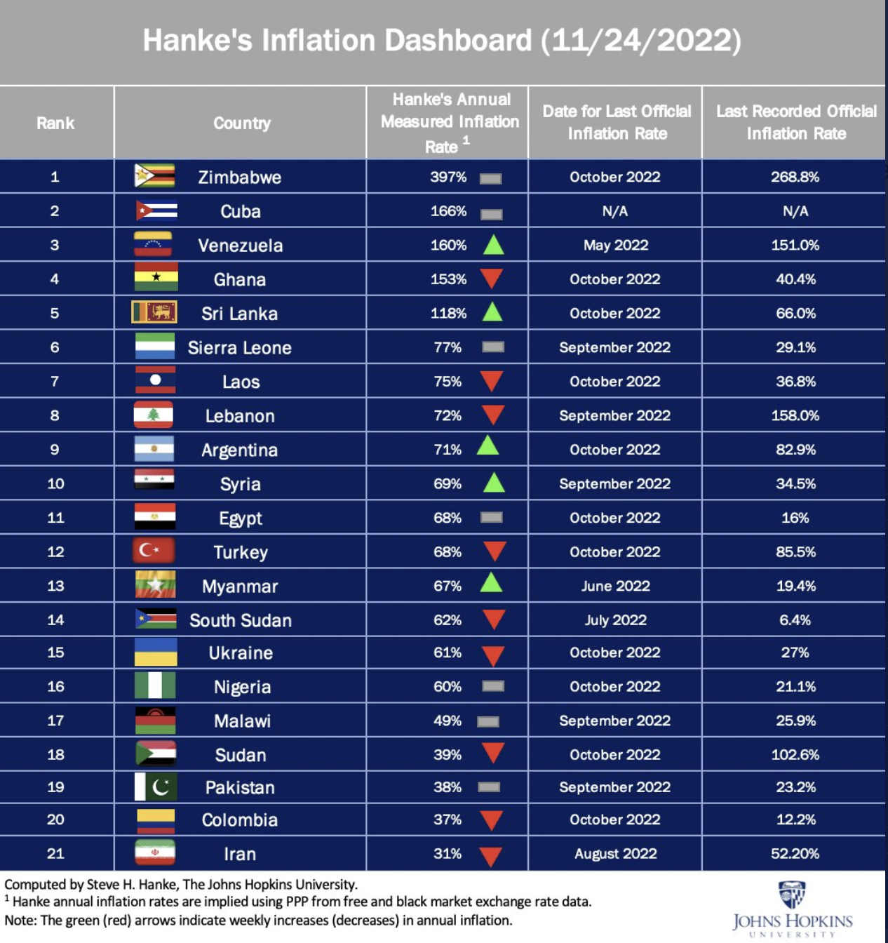 The inflation dashboard shows a similar picture. Zimbabwe leads with an annual inflation of 400%. Ghana is on the 4th place as well with an annual inflation rate of 153%.